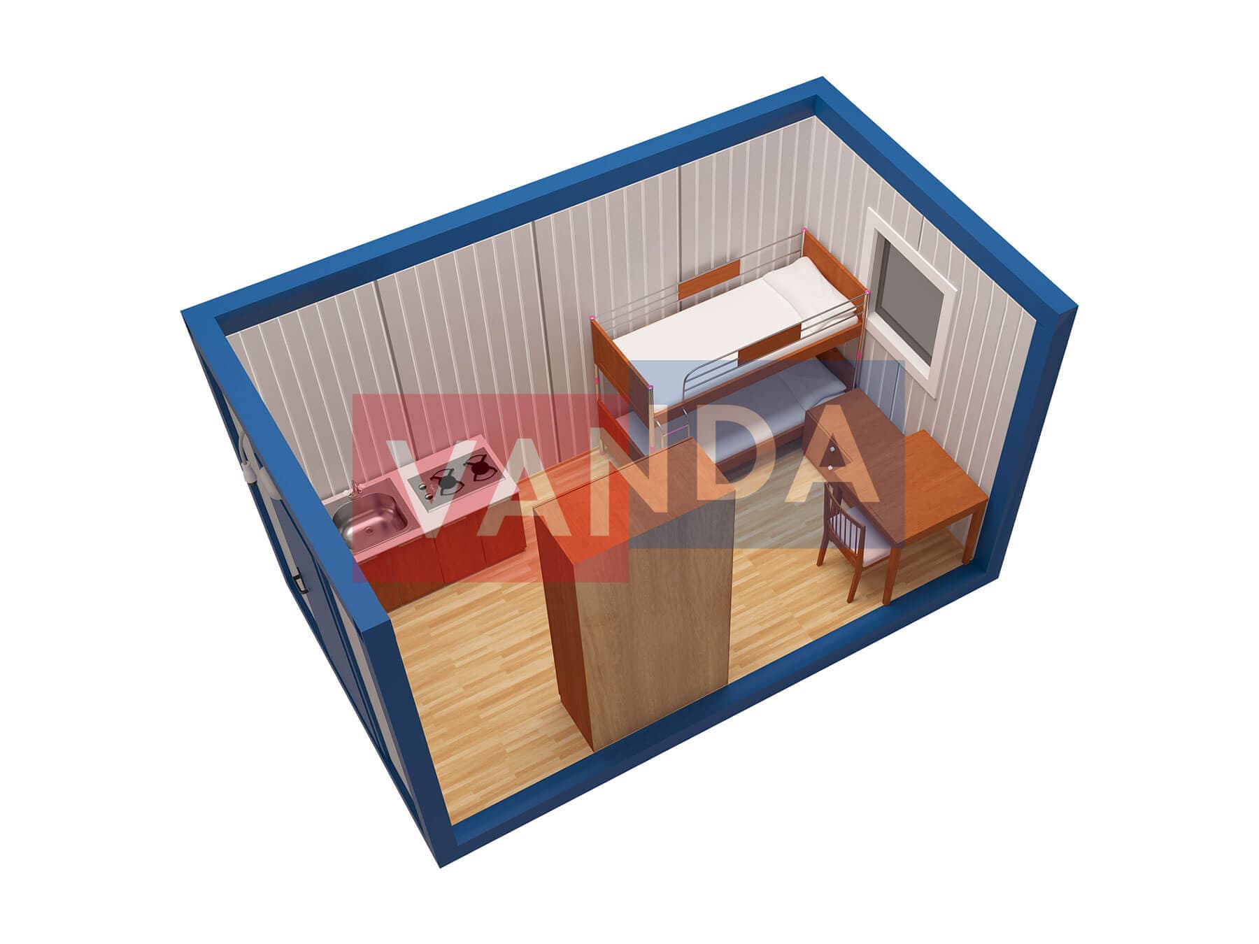 Блок контейнер из сэндвич панелей №1 (вариант 2) изготавливается из несущего каркаса (верхняя и нижняя обвязка): швеллер 120х50х3 мм. или 140х50х3 мм., угловые стойки: сложно - гнутый угол 90х90х3 мм. или 150х130х3 мм., крыша блок-контейнера: металл сварной 0,9-1 мм., качественная наружная отделка: сэндвич панели, внутренняя отделка стен: Сэндвич панели 100 мм., внутренняя отделка потолка: Панели ПВХ, лаги пола: обрезная доска 40х150 мм., лаги потолка: обрезная доска 40х150 мм., выполнено утепление: Пенополистирол – 100 мм. и пароизоляция: пленка техническая, черновой пол состоит из: обрезная доска 20 мм. (2 сорт), чистовой пол покрыт: ДСП строительное 16 мм.. Контейнер комплектуется окнами: ПВХ однокамерное, одностворчатое, п/о 900х1100, входной дверью: металлическая, утеплённая (Россия) и внутренними дверями: МДФ (при наличии перегородки). Если в БК присутствуют перегородки, то делается: каркас из бруска 40х50 мм., обшит с двух сторон панелями ПВХ..